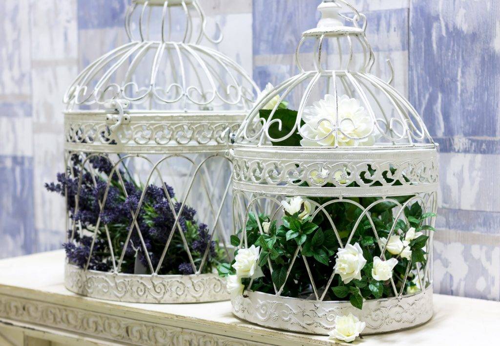 Клетки для птиц. Они часто встречаются в благородном прованском стиле. Клетки выбираются округлой формы. Их дизайн должен быть ажурным и лаконичным. В пустой клетке размещаются цветочные композиции из живых или сухих цветов. Также в клетке можно разместить искусственных птичек, сидящих на виноградной лозе.