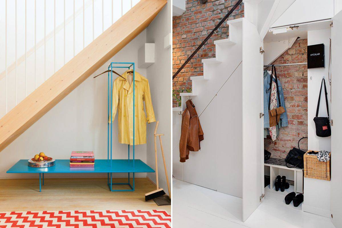 Шкаф, находящийся рядом с лестницей или под ней, — это практичное, удобное решение. Существуют несколько видов подобных конструкций: