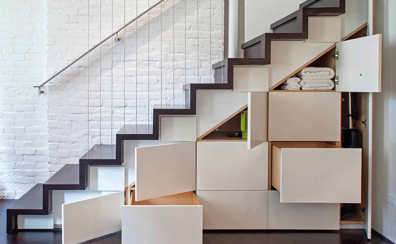 В отличие от полок стеллаж представляет собой полноценную открытую систему хранения. Для удобства стеллажи утапливают вглубь лестницы лишь на треть или половину.