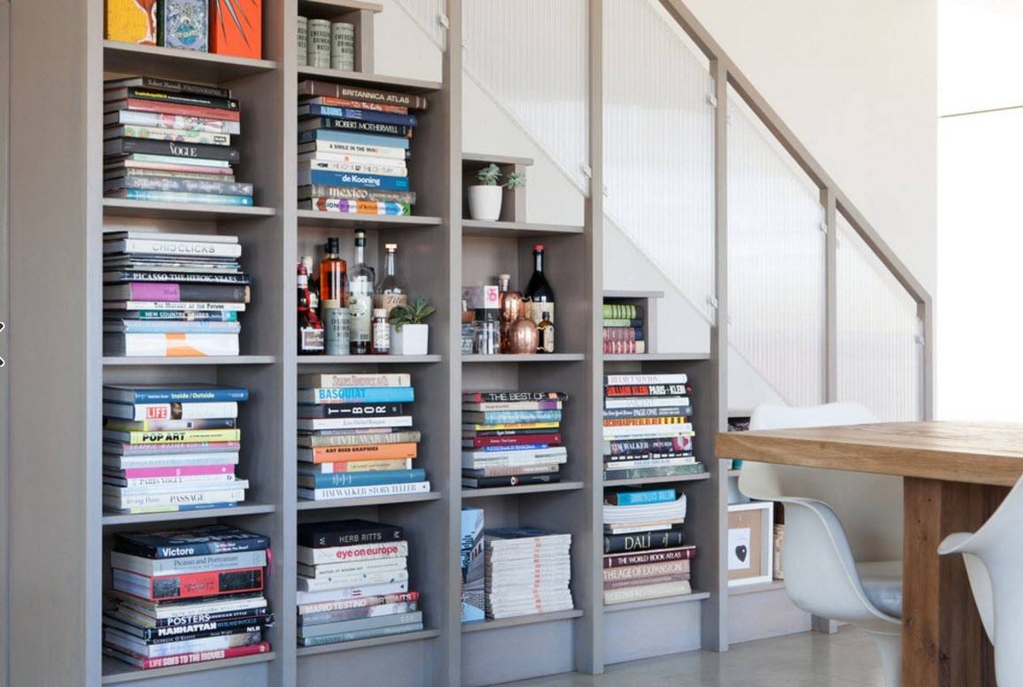 Стеллажи — вы можете повесить сюда две скромные полочки или создать полноценную систему хранения. Все зависит и от ваших потребностей, и от размера подлестничного пространства, а также и от того, насколько хорошо эта зона будет просматриваться с разных позиций относительно остального интерьера.