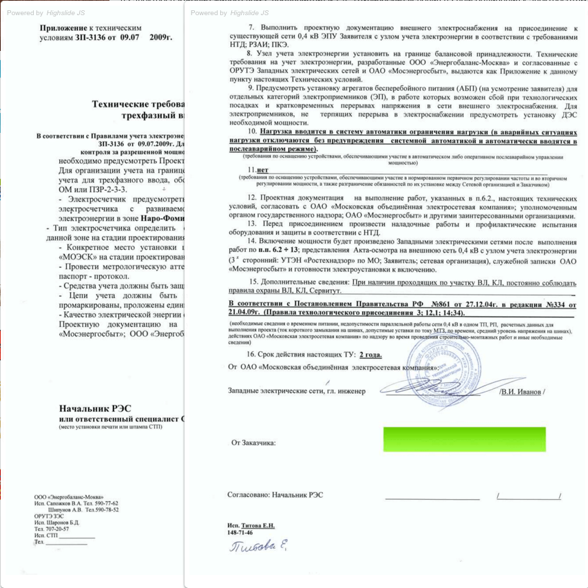 Технические условия на электроснабжение — это документ, содержащий в себе требования, которые необходимо выполнить, чтобы осуществить подключение к сетям электроэнергии, для увеличения потребляемой мощности и т.п. Он является приложением к договору на подключение к электросетям.