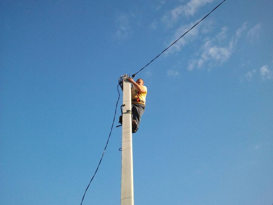 - Между столбами натянуть торс или провод, к нему на специальных хомутах прикрепить токонесущий кабель.