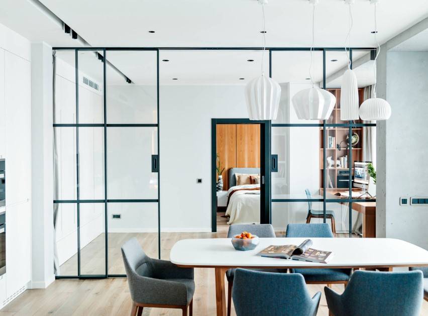 Темные окна и двери в светлом интерьере — это беспроигрышная игра на контрасте