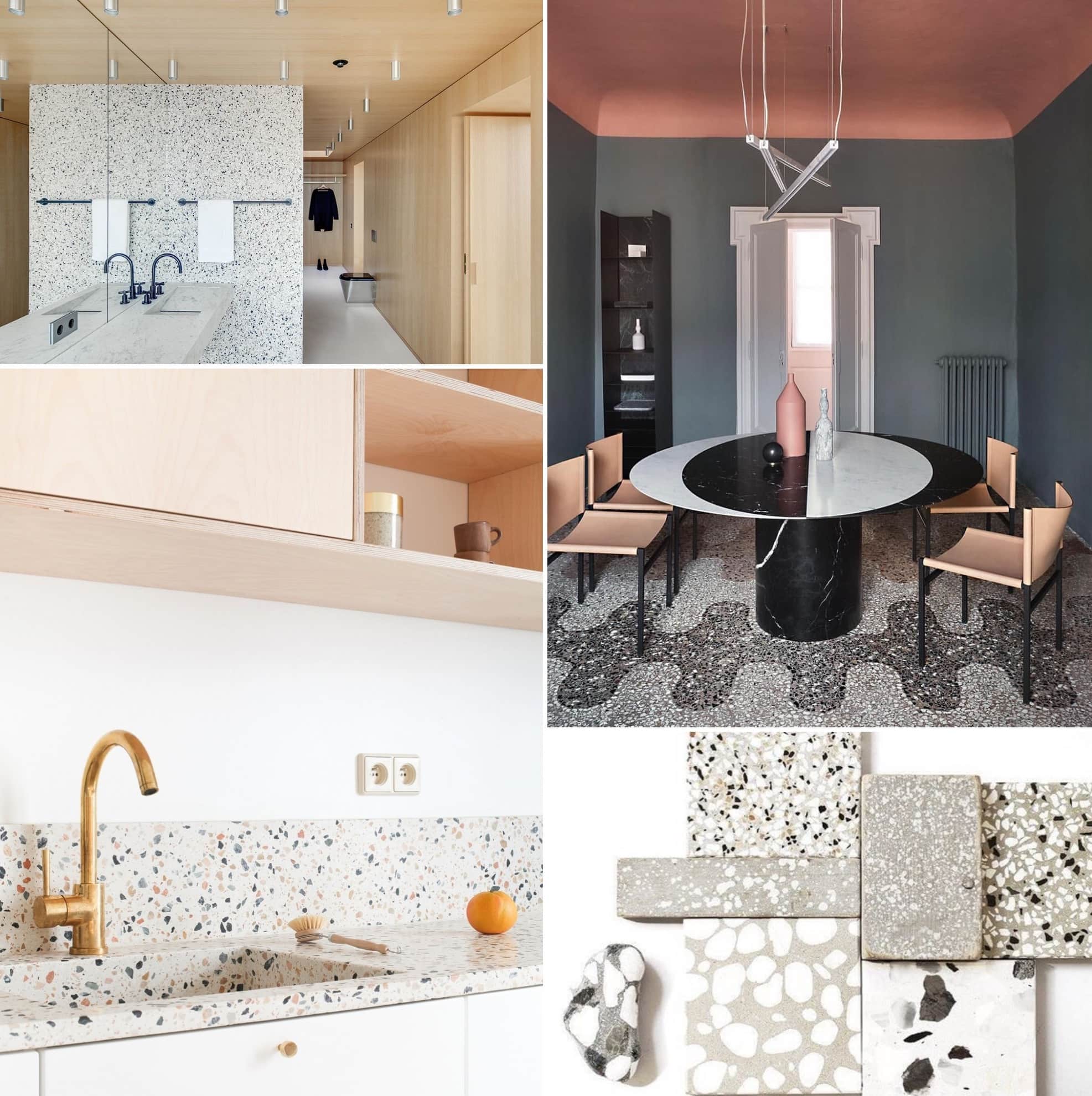 Благодаря высокой прочности раньше по такой методике отделывали полы, а также оформляли лестницы. В современных интерьерах terrazzo появляется на стенах, светильниках, предметах декора, фасадах мебели, посуде.
