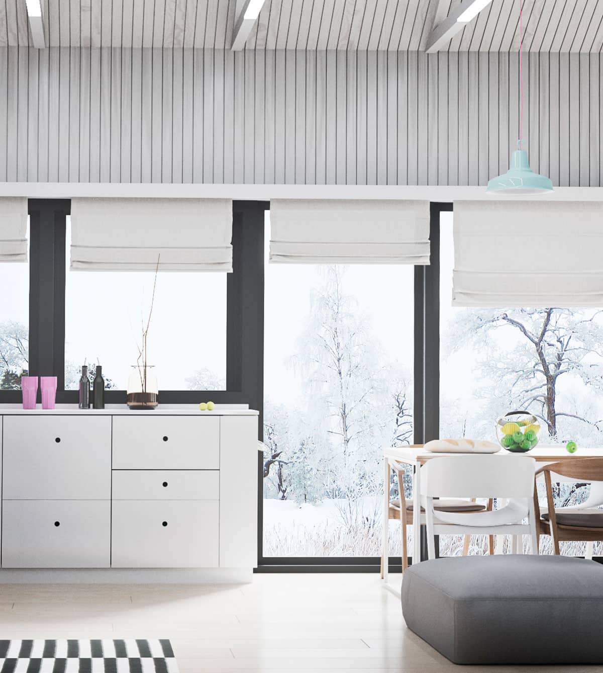 Просторная белоснежная кухня с высокими потолками наполненная свежестью и чистотой