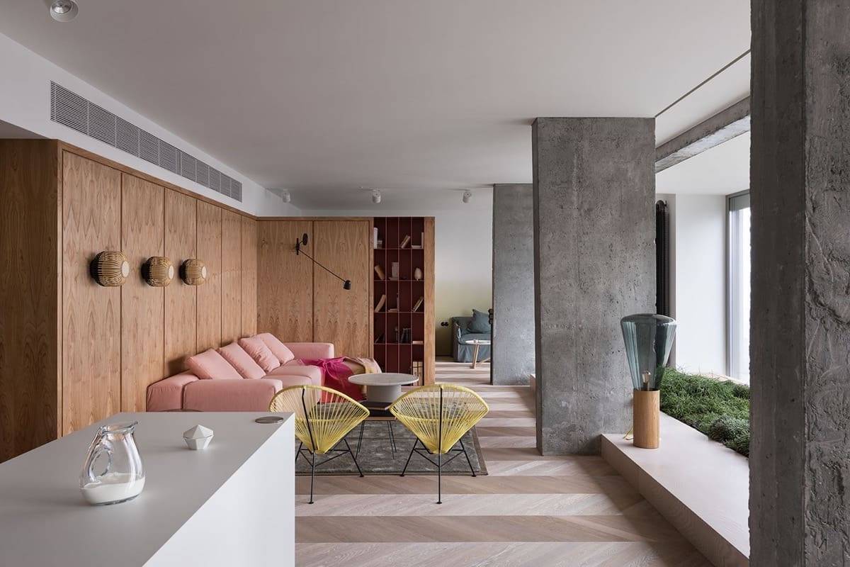 Натуральное дерево и серый бетон – отличная комбинация, создающая тепло и уют