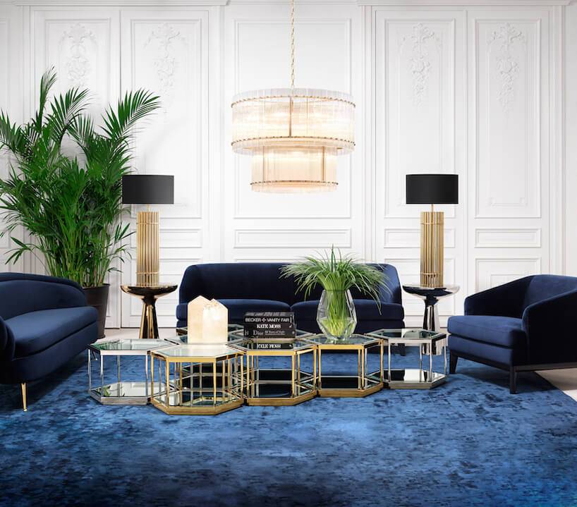 В современных интерьерах становятся хитом сезона золотые акцентные стены, фасады мебели, колонны, каминные порталы.