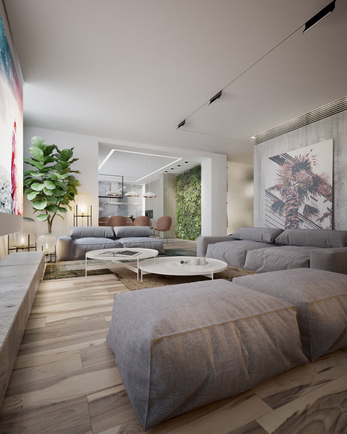 Симбиоз лофта, классицизма и эко стиля — это прекрасный вариант для обустройства современного дома. Однотонное покрытии пола из мраморной плитки, подходящая мебель и правильное зонирование — сделает комнаты светлыми, благородными и уютными.