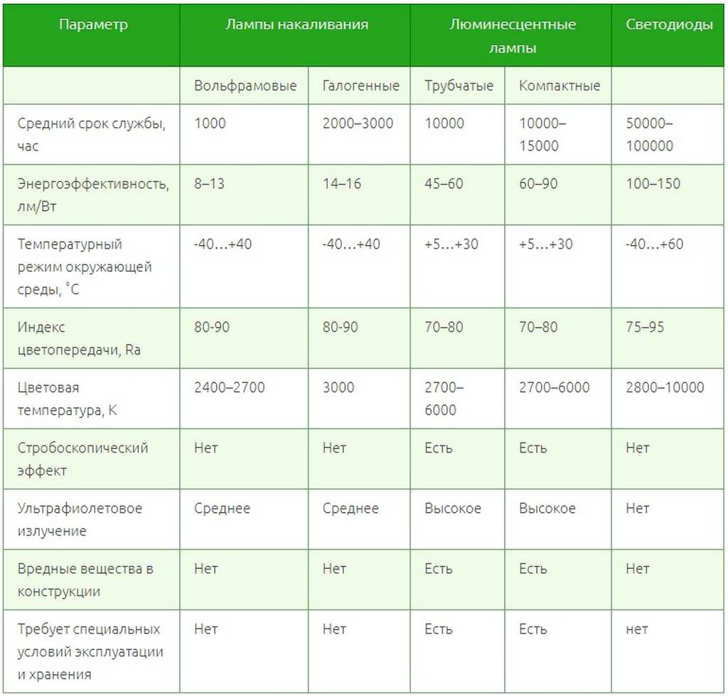 - газонаполненные, в т. ч. и галогенные лампы накаливания имеют срок службы от 2-3 тысяч до десятка тысяч часов;