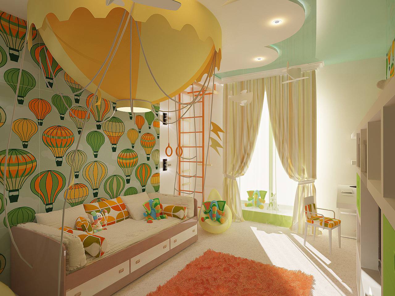 Дети не воспринимают полутона, они видят цвет, поэтому лучше всего использовать природные цвета нормальной интенсивности. В детской комнате не должно быть темных цветов на потолке и стенах, такое оформление будет давить на малыша. Также стоит избегать серого цвета и слишком ярких кричащих агрессивных оттенков.