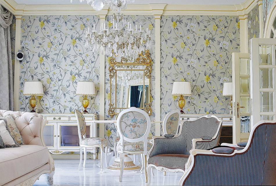 - Стиль прованс – не каждому дано воплотить этот стиль в гостиной. Основа обоев в таком стиле – это нежная цветочная композиция, выполненная в пастельных тонах. Мелкий цветочный принт необходимо умело сочетать со шторами и обивкой мебели.