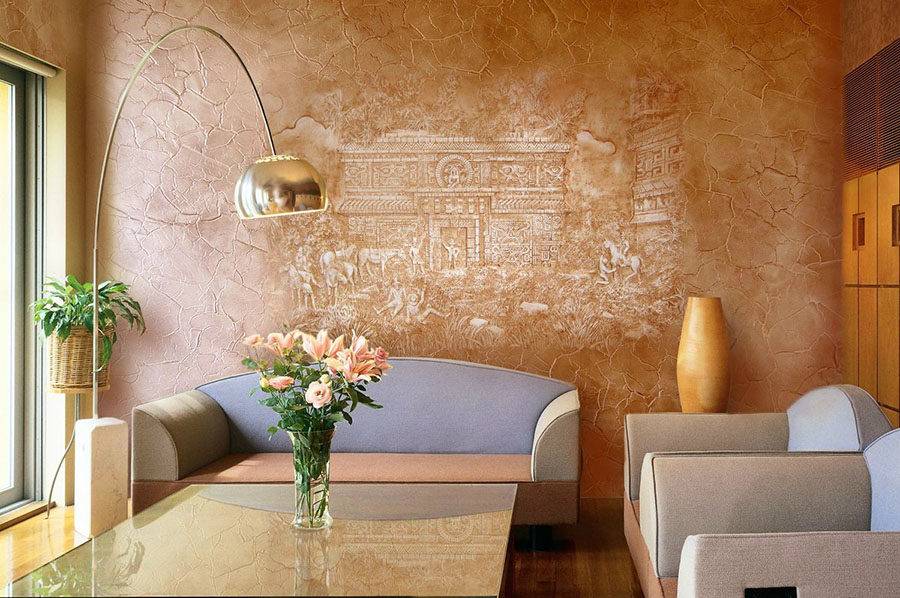 Об экологичности здесь речи, конечно же, не идет. Единственные натуральные компоненты – это все та же мраморная пыль, мелкофракционный песок или целлюлоза. Зато возможности по созданию фактурных поверхностей – практически безграничны. Акриловые составы позволяют добиться эффекта натурального камня, древесины или даже кожи рептилий, не говоря уже о классическом «короеде» или «шубе».