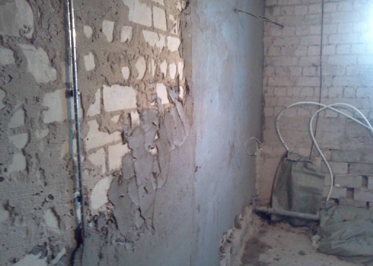 Если стена под неровным углом, слой штукатурки будет превышать 2 сантиметра. В этом случае его лучше изготовить из гипсокартона. При наличии бугров и выпуклостей их устранение осуществляется с использованием зубила. Чтобы убрать углубления, потребуется та же смесь. Она заполняет углубления и остается в нетронутом виде, пока не застынет. Только после этого можно приступать к отделке.