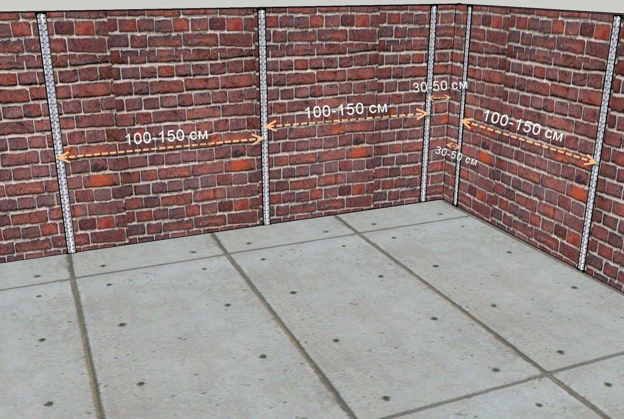 При отсутствии лазерного нивелира можно использовать более старый и проверенный метод: монтаж профилей по отвесам. В качестве последних обычно выступают два шнура, которые прикрепляют к потолку рядом с углами. На самой стене отмечают несколько горизонтальных линий, которые задают шаг от одного дюбеля к другому. Затем к первым двум веревкам перпендикулярно протягивают еще один шнур. Он называется бегунком и используется в случаях, когда необходимо точно разметить промежутки между всеми будущими отверстиями под дюбели, на которые впоследствии будут крепить маяки.