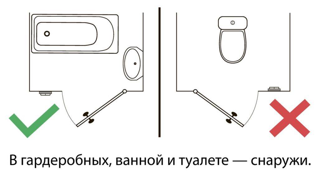 В спальне, холле и гостиной их оптимально устанавливать по евростандарту – возле двери, на высоте опущенной руки. А для ванной комнаты оптимальным вариантом все же является советский стандарт – снаружи этих помещений, на внешней стене