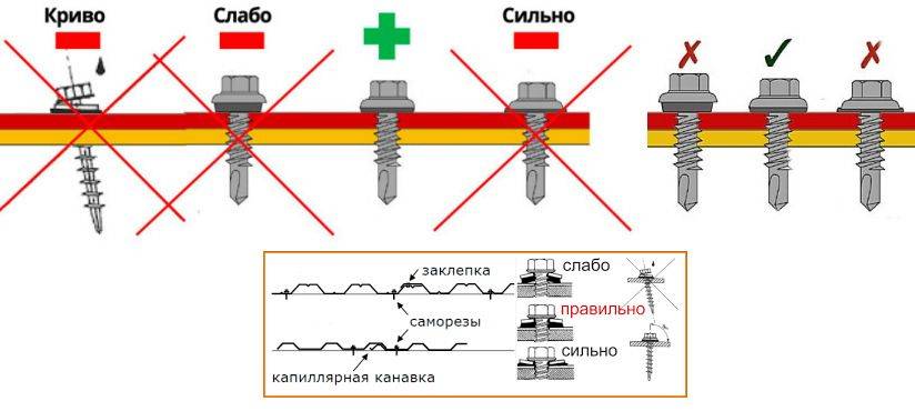 Шлицы головки могут быть разной формы. От этого будет зависеть выбор инструмента для выполнения крепления. Также саморезы могут поставлять в комплекте с резиновыми шайбами, что хорошо сказывается на герметичности соединительного крепежа.