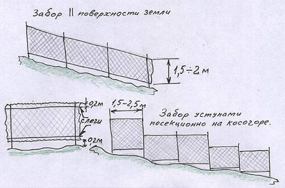 Если на участке заметный перепад высот, строительство забора ведут каскадом (ступеньками). При сравнительно небольшом перепаде сетку можно натянуть параллельно поверхности земли