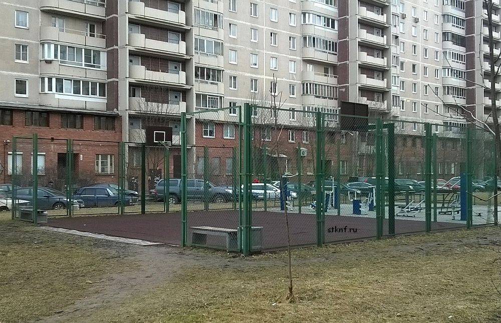 - Работники держат сетку натянутой, а мастер крепит ее.