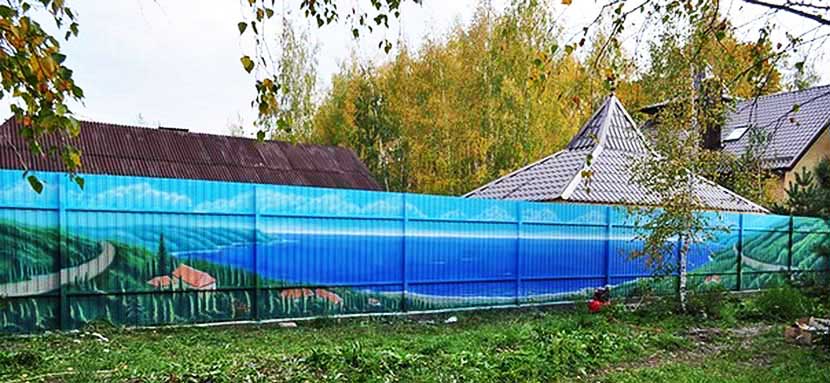 Важно максимально эффективно использовать имеющиеся ресурсы: возможно смешать краски одинаковые по составу, но разных цветов для получения эффектного фона. А после, сравнительно малым количеством цветных, либо художественных красок украсить забор из шифера оригинальной живописью. Забор из шифера волнового можно использовать основой для получения интересного стереоэффекта
