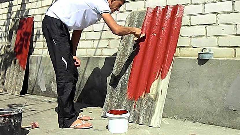 Ситуация усугубляется тем, что асбоцементные листы хорошо поглощают краску, поэтому их практически невозможно качественно окрасить за один проход. Лучший результат получается за два раза – первый слой грунтовочный, для него нужно жидко развести краску. После сушки второй – основной слой, разведённой по норме краской.