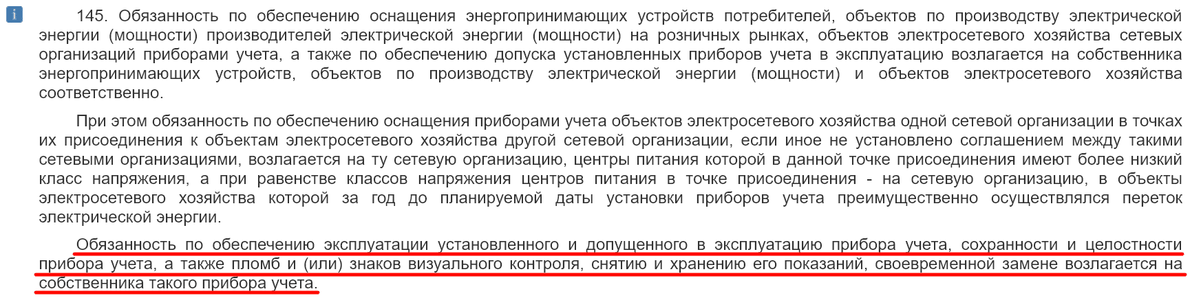Это нужно, чтобы исключить несанкционированное вмешательство в работу счетчика с целью фальсификации показаний. Пломбу вправе устанавливать только специалист обслуживающей компании. Такая услуга оказывается на безвозмездной основе. Это правило установлено пунктом 8 Постановления Правительства РФ от 4 мая 2012 года № 442 «О функционировании розничных рынков электрической энергии, полном и (или) частичном ограничении режима потребления электрической энергии».