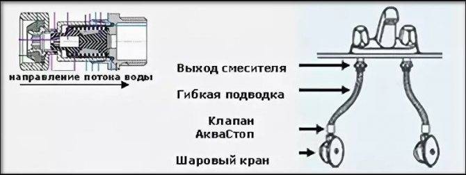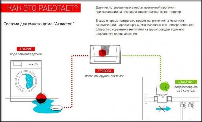 Аквастоп – не считается полноценной защитной системой, представляет собой вспомогательное приспособление, установка которого выполняется, например, перед шлангом стиральной машины. При частичном протекании или обрыве моментально перекрывает подачу воды.