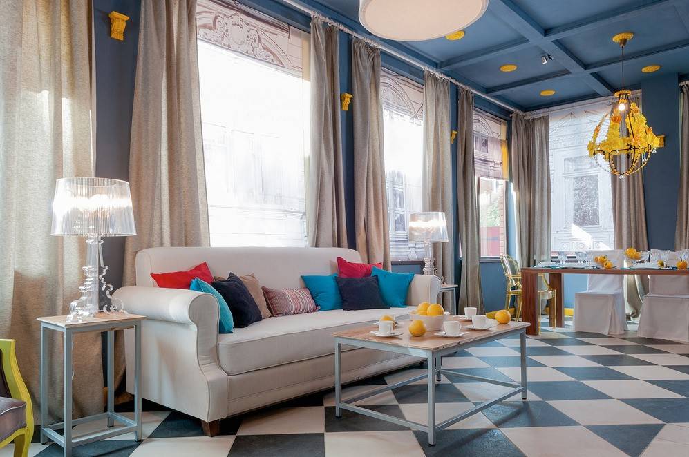 Полы выполняются из мозаики, керамики, доски. Хорошо, если узор на плитке сочетается с рисунком на шторах, цвет обивки дивана дублируется в ярком принте на стене, а плавные линии спинок стульев отражаются и изгибах обрамления большого зеркала.