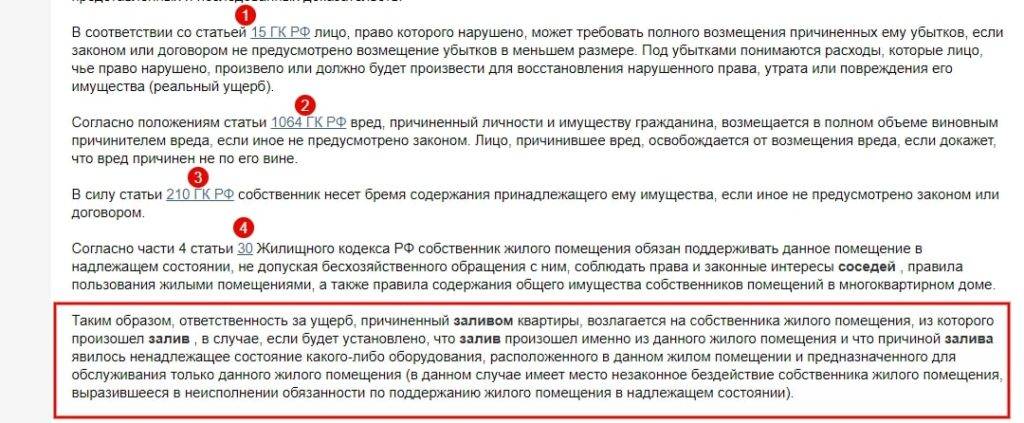 После составления акта, необходимо определить виновника затопления. Гражданский Кодекс (в статье 290), Жилищный Кодекс (в статье 36) и Правила содержания общего имущества в многоквартирном доме (в разделе 1) предусматривают следующие принципы определения виновных:
