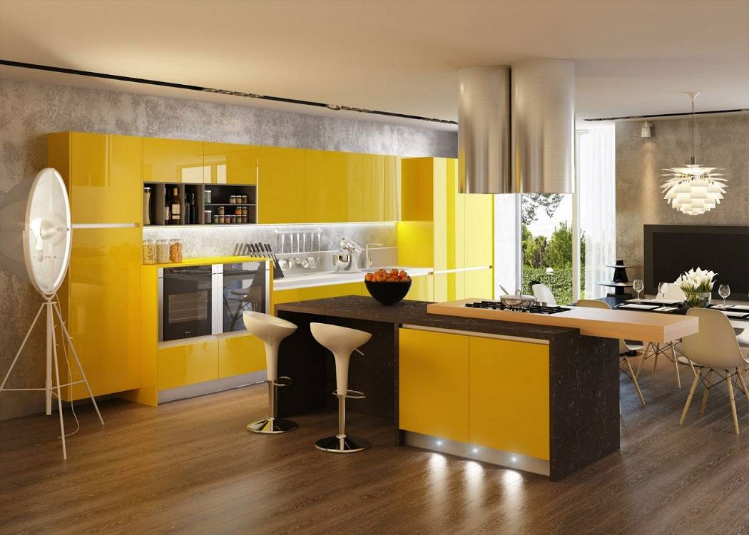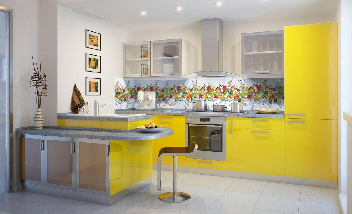 В этом помещении можно проводить эксперименты и сочетать более яркие цвета и оттенки. И все же интерьер кухни в желтых цветах должен быть продуманным. Если вы отдаете предпочтение стильному кухонному гарнитуру с яркими желтыми фасадами, то позаботьтесь о светлом фоне, который не будет выглядеть контрастно и агрессивно. Так, например, сочетание белого и желтого на кухне ассоциируется с чистотой и при этом усиливает аппетит. Можно использовать желтый цвет в интерьере кухни в качестве акцентного. Хорошо будут смотреться желтые барные стулья, посуда, занавески и предметы декора. Вы также можете выделить одну стену или определенную зону, например, «фартук».