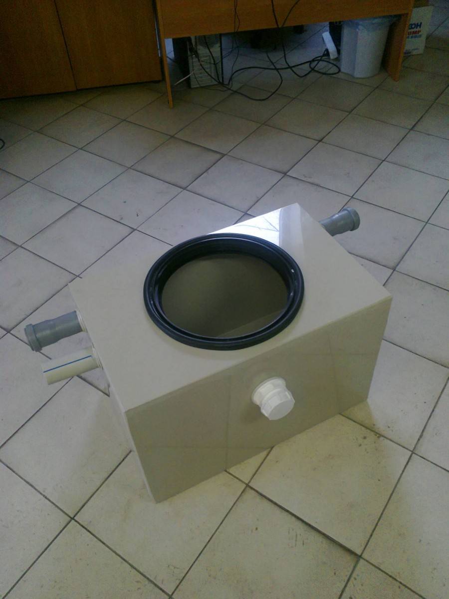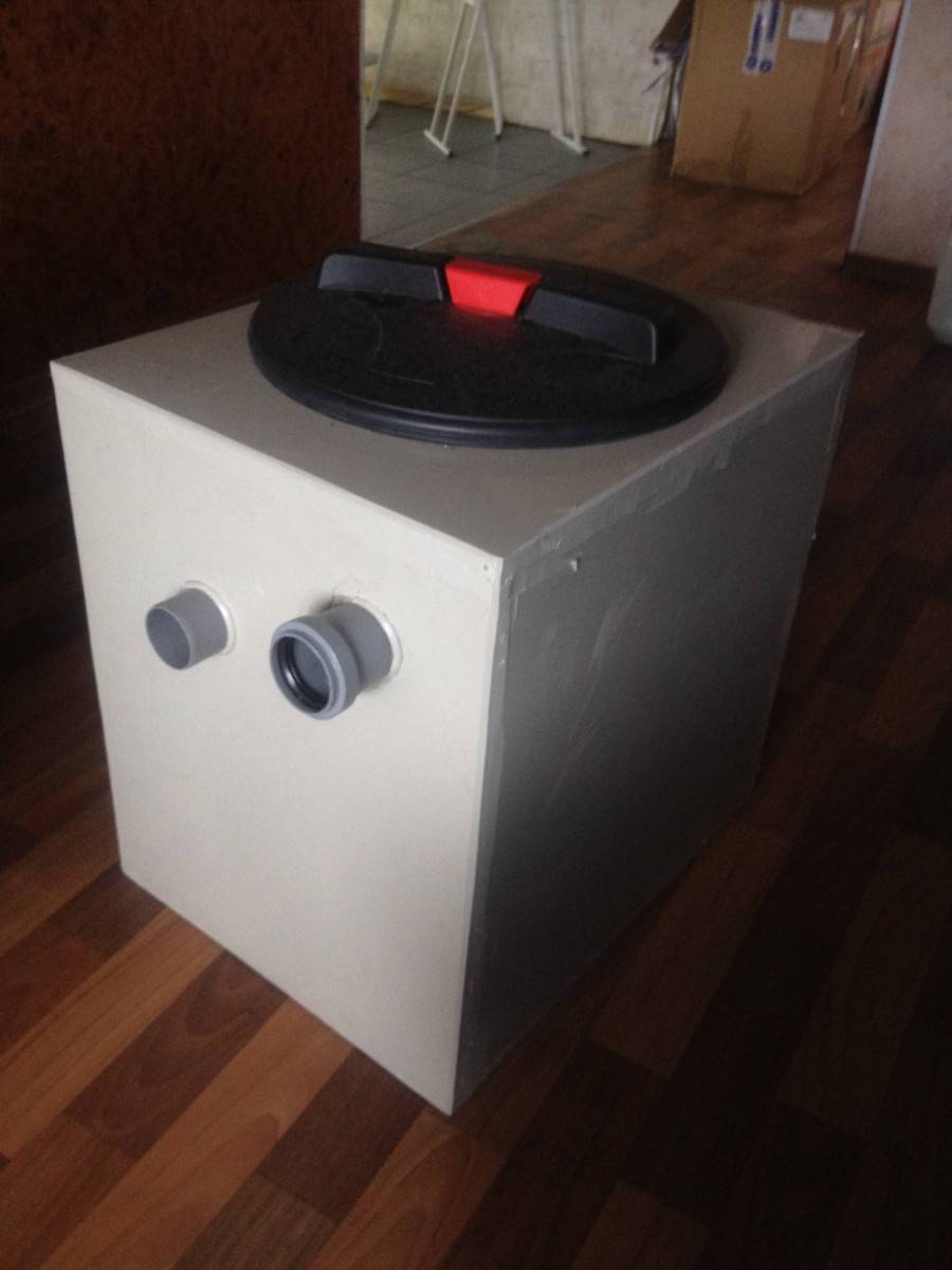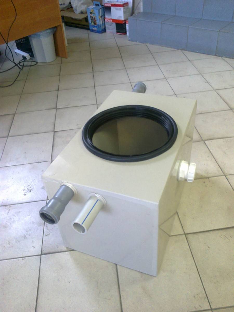 - Монтируем вводное колено, а все места соединений мажем силиконовым герметиком. Там, где крышка соединяется с коробом, надо приклеить уплотнительную ленту. Закрыв крышку, ожидаем застывания герметика. Аппарат для уловления жира перед входом в канализацию – готов.