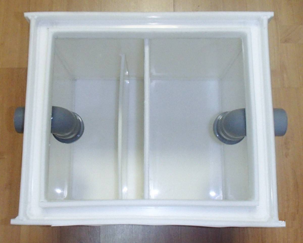 - Для подключения системы к канализации есть «холостая» соединительная трубка с противоположной стороны контейнера жироловки. К ней присоединяется патрубок или гофра через соединительную муфту, которые уже дальше соединяются с канализационным коммуникациям.